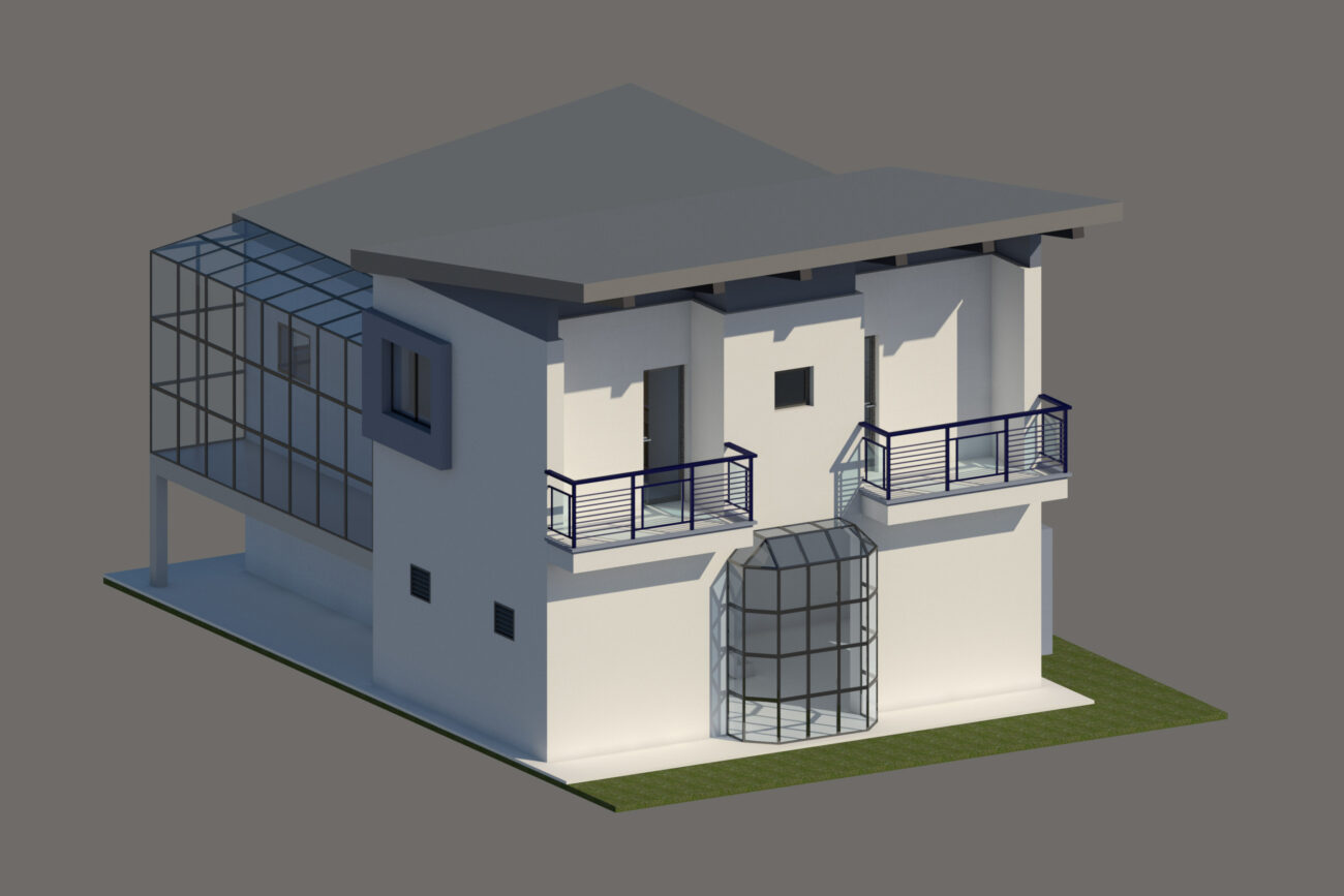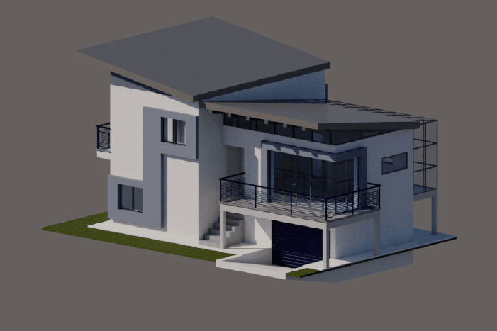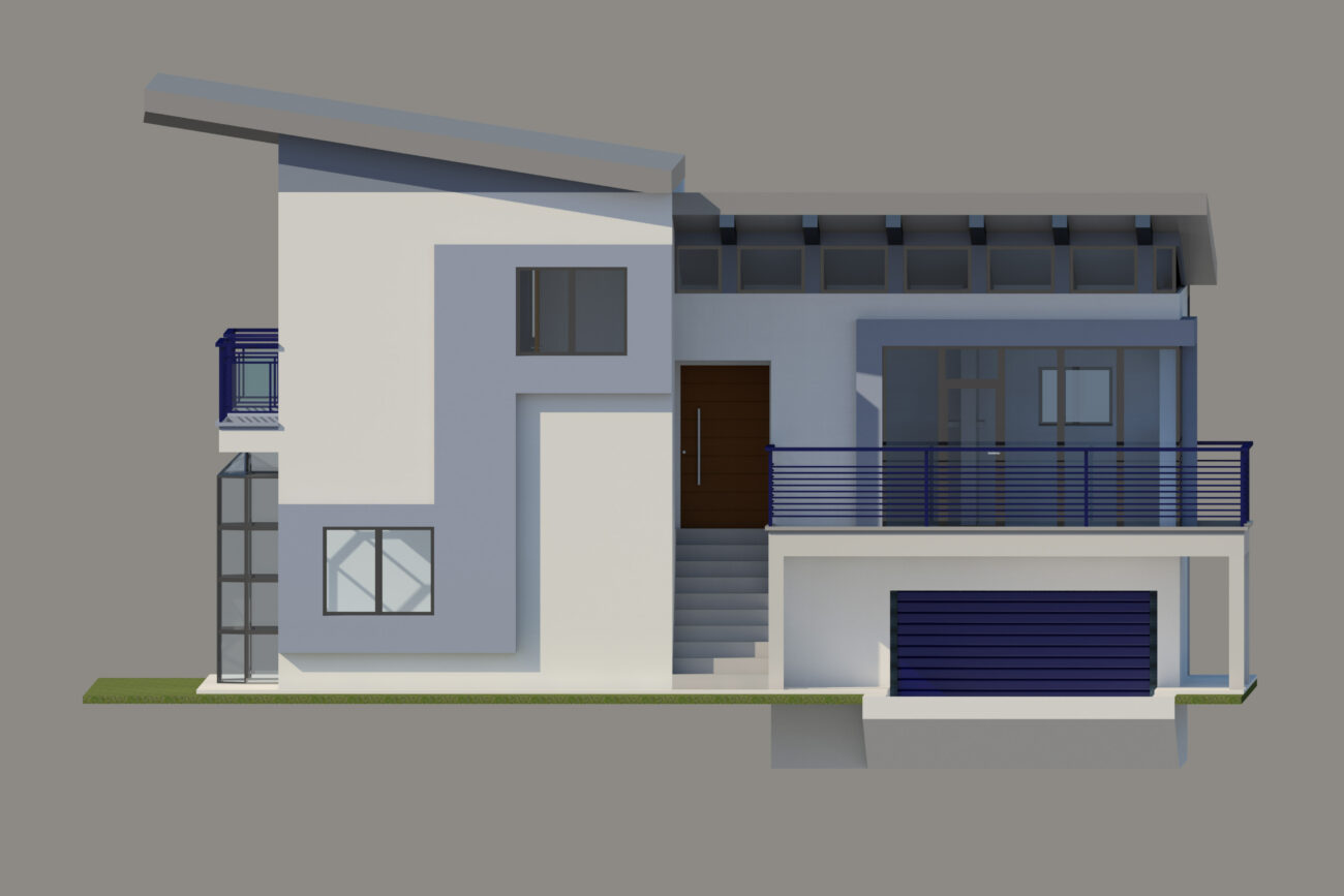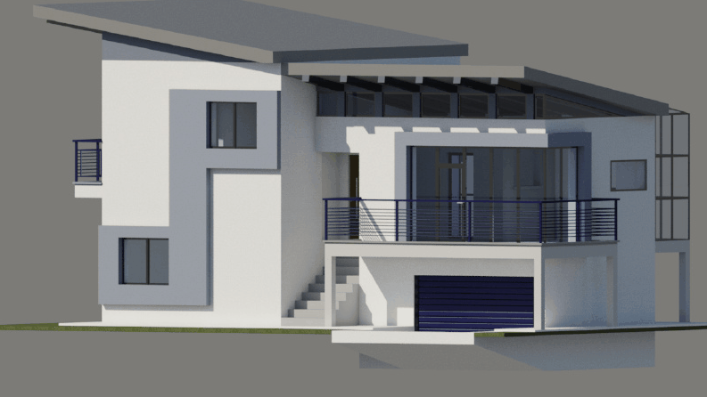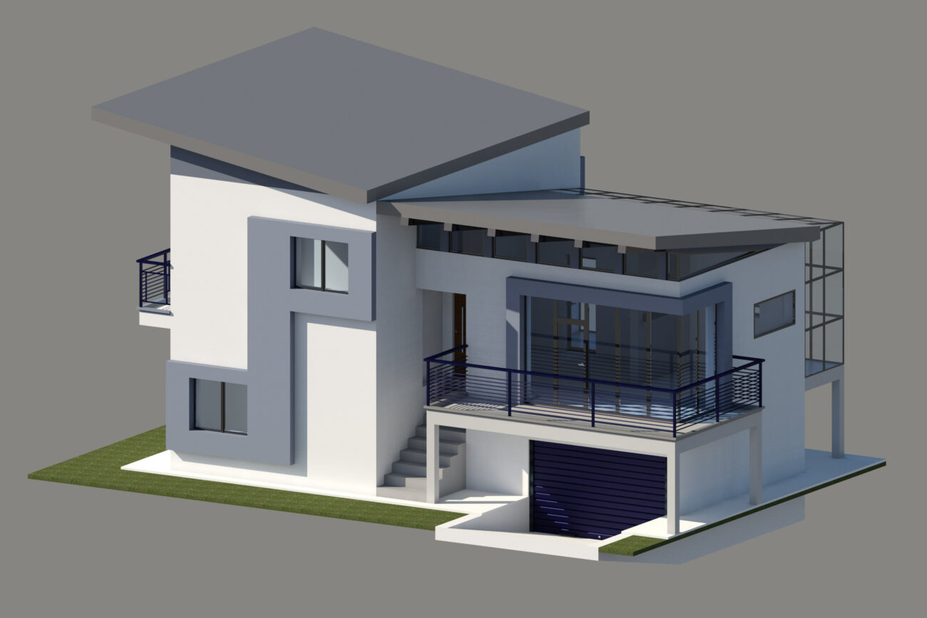 This was a small project created to test Autodesk’s cloud rendering capabilities. What’s interesting about this project is that it’s basically two different building joined by a stairwell. The west side features a 2 floor structure starting from +0.00 elevation while a third room is attached at the east side of the stair with a garage underneath it going below the ground elevation. The results on Autodesk’s cloud service were good enough but for some reason it misread the material colors and textures and couldn’t render them the same way they appeared in the actual program.